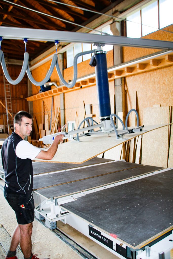 Dle plánů a přání zákazníka vyrábíme dřevěné stěny v libovolné tloušťce a s příslušnou izolací. Vše je navrženo na počítači a následně přeneseno do stroje. Desky jsou zvednuty přísavkou, aby bylo možné přesunout a umístit velké součásti (Foto: MuW/m.wagner)